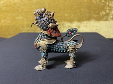 Antique Tibetan Brass Wire Foo Dog Inlay Coral Figurine Glass Eye
