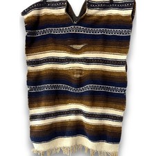 Vintage Mexican Poncho Serape Blanket Blue Brown Striped 72 x 25 With Slit