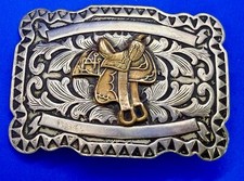 Antique Horse Saddle Ornate Accents Belt Buckle With Blank Ribbon Award