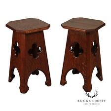 Arts and Crafts Antique Pair of Oak Cut-Out Taboret Side Tables