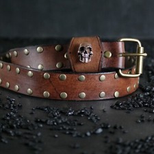 Studded Leather Belt. Custom SKULL Belt Loop. 1.5 inches wide. Antique BROWN