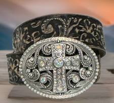 Justin Leather Belt Buckle Cross Brown 34 Rhinestones Tooled Antique Bling EUC