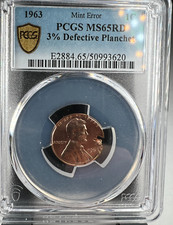 1963 P Lincoln Penny Cent, 1C, 3% Defective planchet ERROR PCGS MS 65 RD