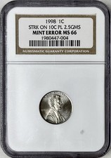 1998 LINCOLN CENT STRUCK ON DIME PLANCHET MINT ERROR NGC MS66, HIGH GRADE!
