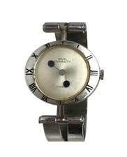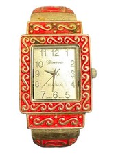 Geneva Platinum Watch Women Silver Tone Red Enamel Open Cuff Vintage Mid Century