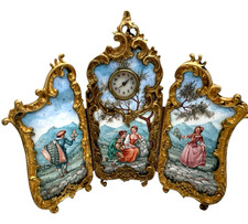 Antique Viennese Miniature Porcelain & Bronze 3 Panel Enameled Screen with Clock