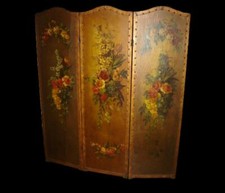 Antique Italian 3 Panel Leather Hand Oil Painting Flowers Screen Coromandel Rare