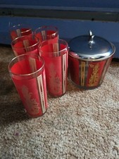 VTG Mid Century Culver Red Siam Thai Dancers 22K Gold Ice Bucket W/5 Glass Cup