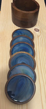 Vintage Set of 6 Wood Agate Geode blue Crystal Stone Coasters Mid Century