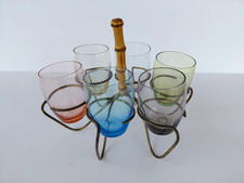 Vintage Colored Shot Glass Set MCM Mid Century Bamboo Handle Brass