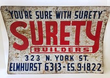 Vintage 1940's-50's Surety Builders Metal Advertising Sign Elmhurst IL