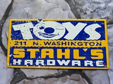VINTAGE 1950'S TOYS PORCELAIN SIGN STAHL'S HARDWARE 10"×5".