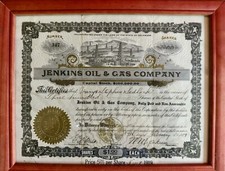Framed Antique Wall Street 1919 Jenkins Oil & Gas Company Stock Certificate