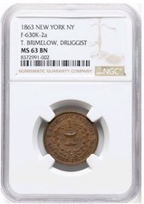 1863 US T. BRIMELOW Druggist New York NY Civil War Token 630K-2a NGC MS 63 BN