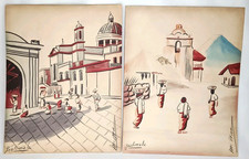 Mid Century Modern Watercolor Guatemala City Scene Set Of 2 M Navas 1950s