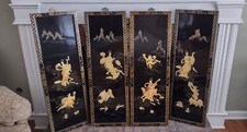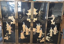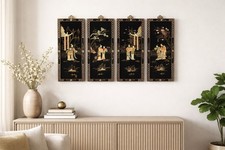 Vintage Chinese Black Lacquer 4 Panel Wall Art Chinoiserie Gold Inlay Set MCM
