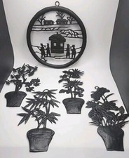 5 Piece Mid Century Chinese Tin Cut Out Metal Art Silhouette Flowers Plants