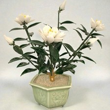 Xlarge Vintage Mid Century Chinese Jade Glass Bonsai Flower Tree, Flowering Xtra