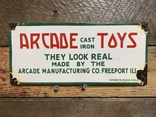 ARCADE CAST IRON TOYS DEALER PORCELAIN METAL SIGN FREEPORT HUBLEY GAS OIL TAXI