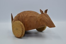 VTG Armadillo Southwest Hand Carved Wood & Leather Toy Sculpture W Wheels Signed