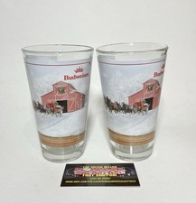 Budweiser Clydesdales Barn Holiday 16 Oz Pint Beer Glasses Set Of Two (2) New!