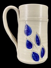 Antique Williamsburg Pottery Salt Glaze Pottery Cobalt Blue Enamel Leaf Beer Mug