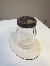 vintage GLASS JAR BOTTLE w/ Embossed CLOCK FACE plus METAL LID Patent 95888