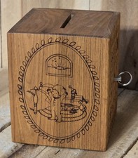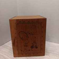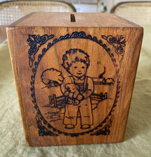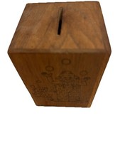 Wooden Coin Bank Music Box – Etched Children Folk Art, Brahms’ Lullaby Vintage