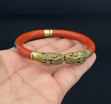 Antique Chinese Export Red Cinnabar Cloisonne Bangle Serpent Head Brass Bracelet