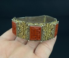 Antique Chinese Export Red Cinnabar Vermeil Chinese Goodluck Filigree Bracelet