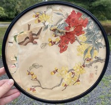VINTAGE / ANTIQUE CIRCLE ROUND LAQUER POEM BIRD SIGNED PAINTING REPAIR ASIAN