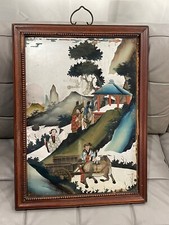 Antique Chinese Reverse Painted Glass Painting w Man Donkey Cart Women Landscape