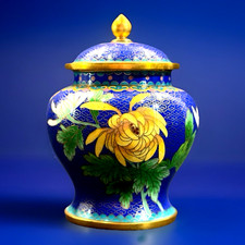 Early 20th C. Antique Cloisonné Enamel Ginger Jar w/ Lid, Cobalt and Yellow 6"