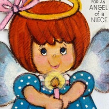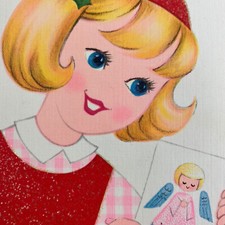 Vintage Mid Century Christmas Greeting Card Cute Angel Girl Glitter Hallmark