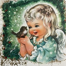 Vintage Mid Century Christmas Greeting Card Cute Angel Girl Holds Bird Green