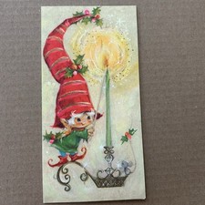 Vintage Mid-Century Christmas Card Elf Pixie Lighting A Candle Retro