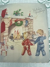 Adorable VTG MCM Christmas Card Children In Pajamas Loose Backside Flap (used)