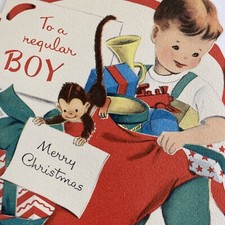 Vintage Mid Century Christmas Greeting Card Boy With Stocking Full Of Toys