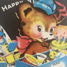 Vintage Mid Century Birthday Greeting Card Cute Teddy Bear Cake Toys Dog Die Cut
