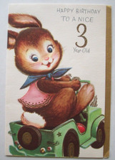 Vtg NORCROSS Birthday Card 3-Year-Old ANTHROPOMORPHIC BUNNY RABBIT TOY & DUCK