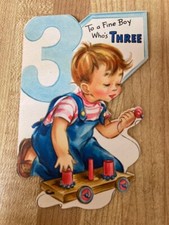VTG 1949 HALLMARK DIE CUT TO A FINE BOY WHO'S THREE W/ VINTAGE WOODEN PULLTOY