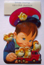 Little boy w chicks on toy truck embossed vintage Birthday Greeting card *0017