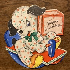 Vintage 1940s Hallmark Happy Birthday Card Dog Riding Toy Wooden Rocker P1G