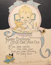 Vtg Rust Craft Birthday Card Diecut One Year Old Baby Highchair Cake Toy Dog 30s
