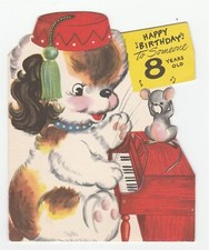 Vintage Birthday Card Dog Plays Toy Piano Mouse Child 8 Years Old Forget Me Not