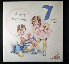 Vintage 7th Birthday Card Little Boy And Girl Toy Airplane Lucky Number 7 Cake