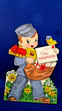 VINTAGE GREETING CARD BIRTHDAY 'FOR GRANDSON' DIE-CUT ADORABLE MAILMAN TOY TRAIN