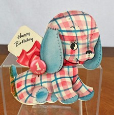 VTG Birthday Card Paper Ephemera 1940s Gingham Stuffed Dog Toy One Year Old Pin