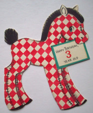 Red checked flocked toy horse vintage birthday greeting card *LL1
