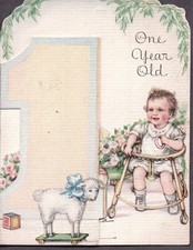 VINTAGE 1948 'ONE (1) YEAR OLD' BIRTHDAY CARD DIE-CUT BABY & BEAR TOY ON RUG